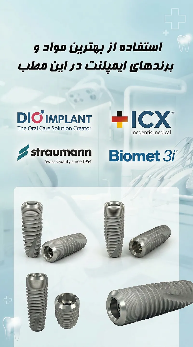 ارائه ایمپلنت های اروپایی از بهترین برندهی معتبربین المللی با ارائه گارانتی درمان که با استفاده از روش کاشت فوری بدون درد و خونریزیی در یک جلسه در این مطب انجام می شودضامن سلامتی دندان شماست…